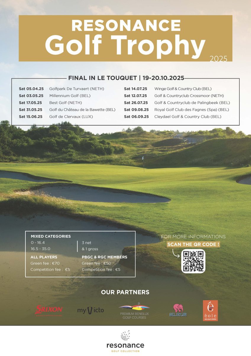 Nous espérons vous voir participer nombreux aux 10 qualifications du Résonance Golf Trophy 2025 (nouvelle dénomination pour l’ancien Open Golf Club Trophy) qui amèneront directement 30 d’entre vous à la grande finale des 19 et 20 octobre au Touquet et Hardelot.