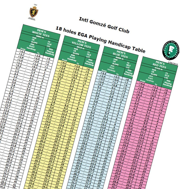 Voyez combien de strokes vous aurez cette année sur les 2 premières pages du PDF: Attention: La 1ère concerne les Hommes pour le 4 tees possibles, la 2ème les Dames.