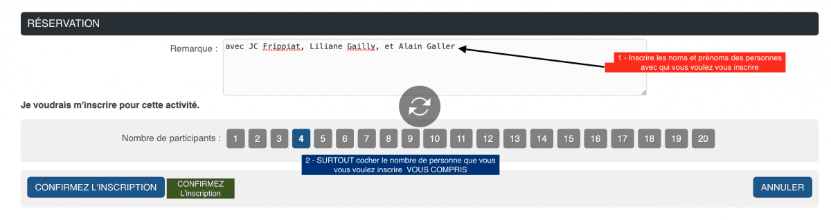 Procédure : inscrivez en lien avec votre nom le nombre de joueurs et dans la case remarque le nom des personnes supplémentaires au max de trois.