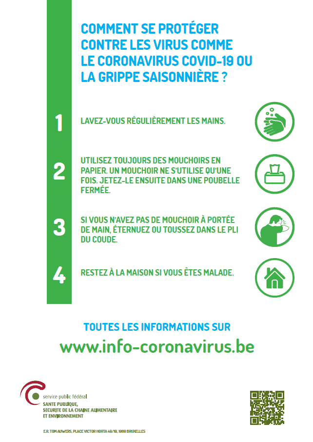 Toutes les dernières informations peuvent être obtenues sur: https://www.info-coronavirus.be/fr/ et sur le site www.afgolf.be.