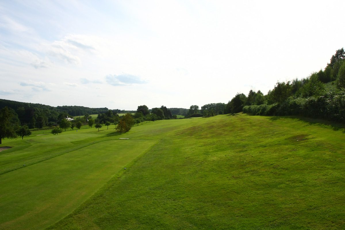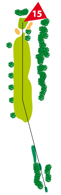 Par 4 de 404 mètres, handicap 2, longé sur la droite d’abord par des buissons, ensuite par une sapinière. Out of bounds sur toute la longueur. Rangée d’arbres fruitiers sur la gauche. Deux bunkers defendent un grand green à plusieurs niveaux.
